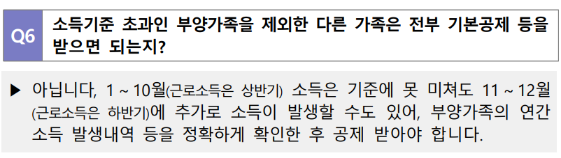 6. 소득기준 초과인 부양가족을 제외한 다른 가족은 전부 기본공제 등을 받으면 되는지?