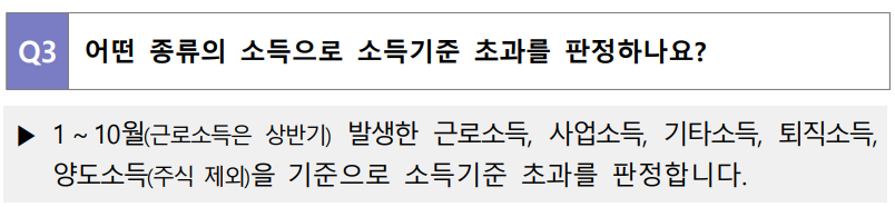 1 ~ 10월(근로소득은 상반기) 발생한 근로소득, 사업소득, 기타소득, 퇴직소득, 양소소득(주식제외)을 기준으로 소득기준 초과를 판정합니다.