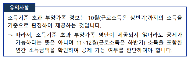 [유의사항] 소득기준 초과 부양가족 명단이 제공되지 않더라도 공제가 가능하다는 뜻으 아니며 11~12월(근로소득은 하반기) 소득을 포함한 연간 소득금액을 확인하여 공제 가능 여부를 판단하여야 합니다.