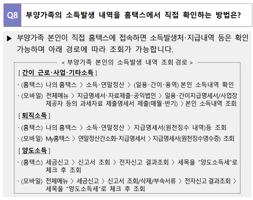 8. 부양가족의 소득발생 내역을 홈택스에서 직접 확인하는 방법은?
