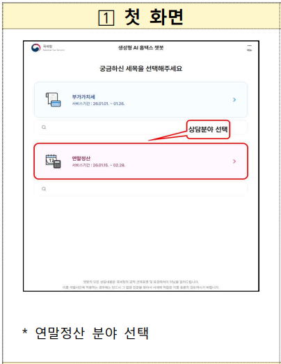근로자가 다양한 채널을 통해 연말정산 궁금증을 해소할 수 있도록 올해는 AI 전화 상담에 더해 생성형 AI 챗봇 상담도 시범운여(1.15. 부터) 합니다.
